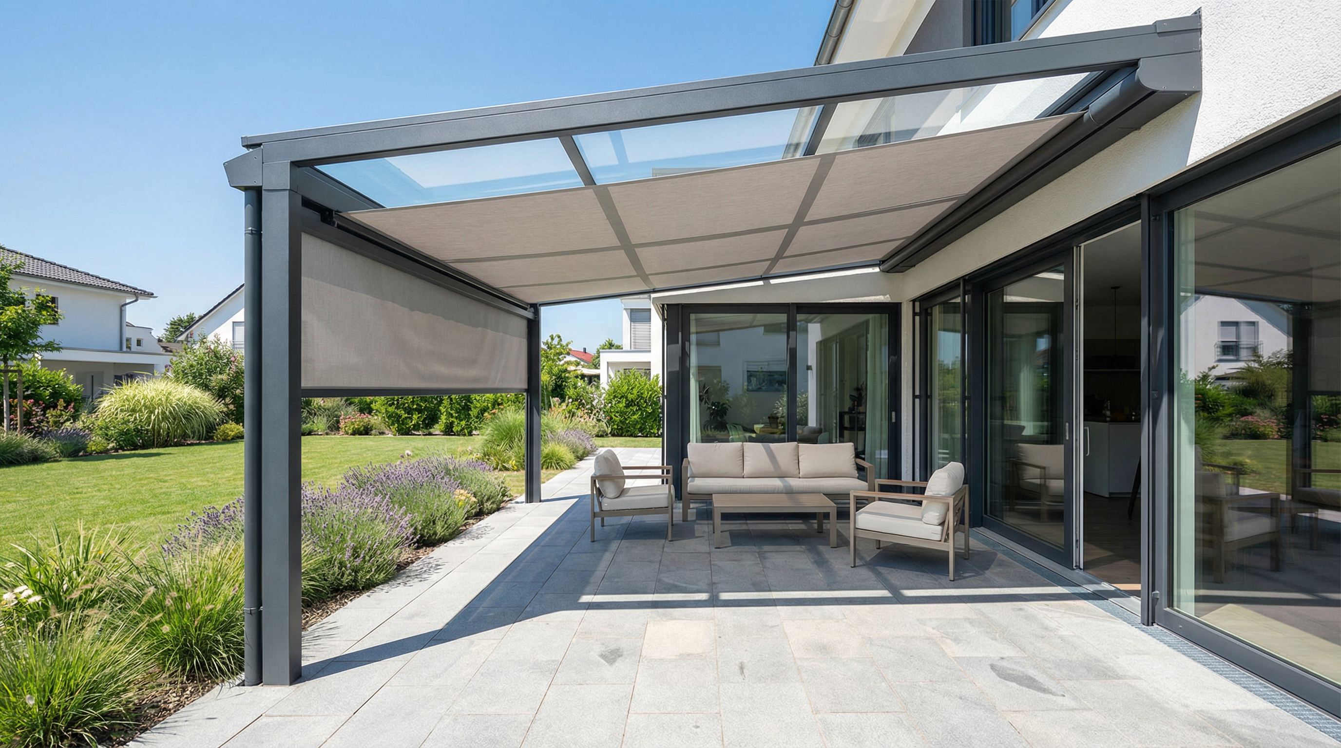 Schutz vor Regen, Wind und UV-Strahlung. Ihre Terrasse bleibt trocken und Ihre Gartenmöbel geschont.