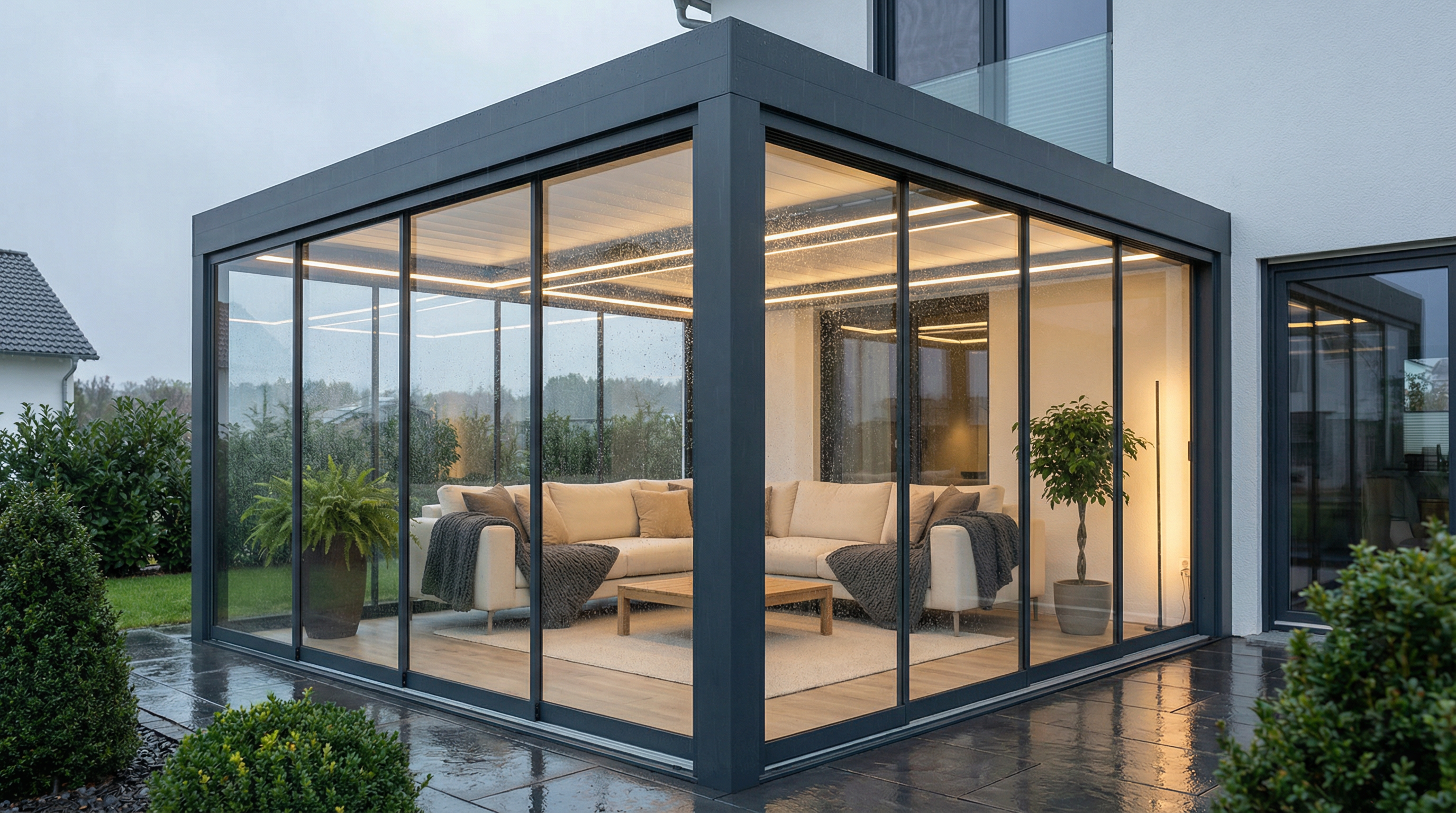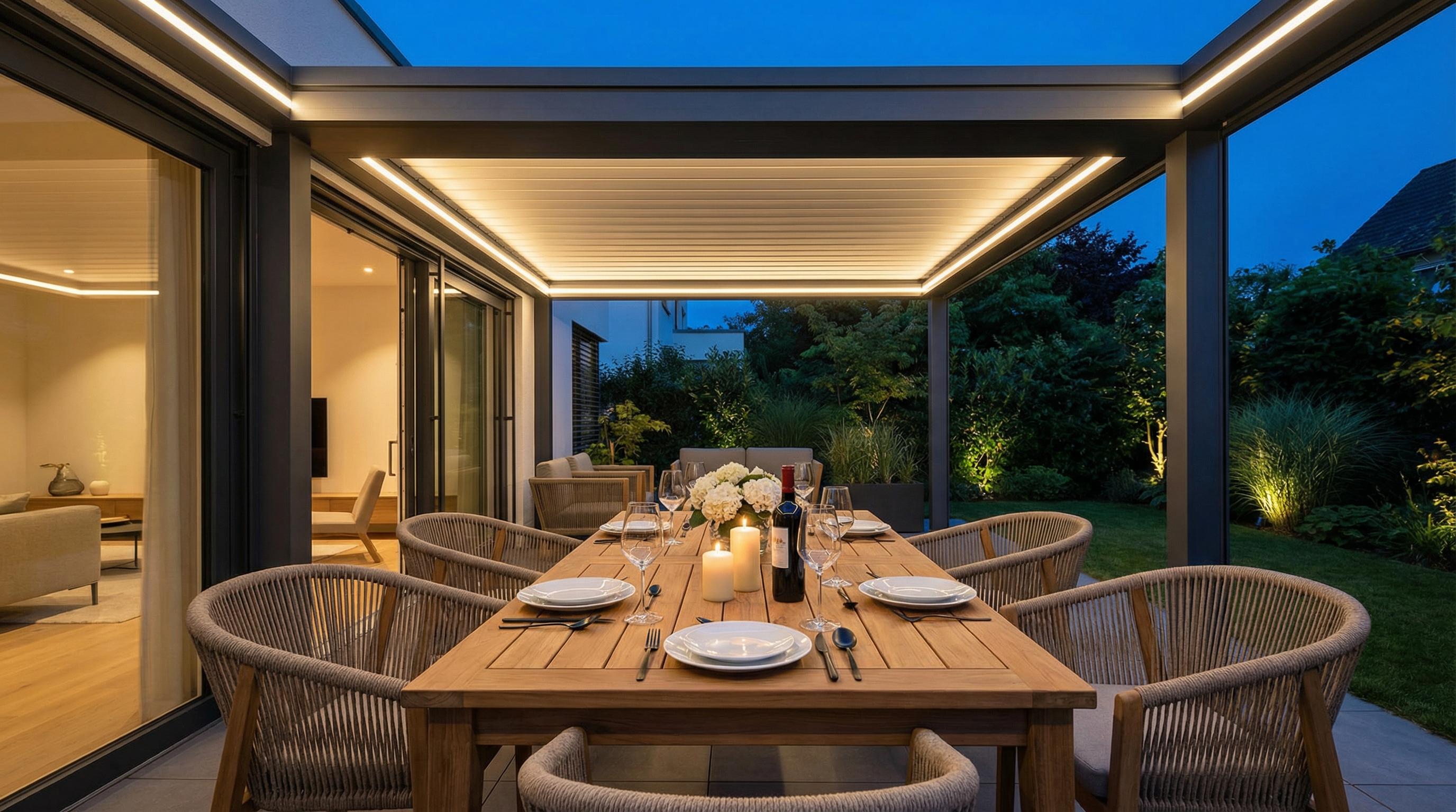 Integrierte LED-Leisten setzen stimmungsvolle Akzente. Infrarot-Heizstrahler verlängern die Terrassensaison bis in die kühlen Abendstunden.